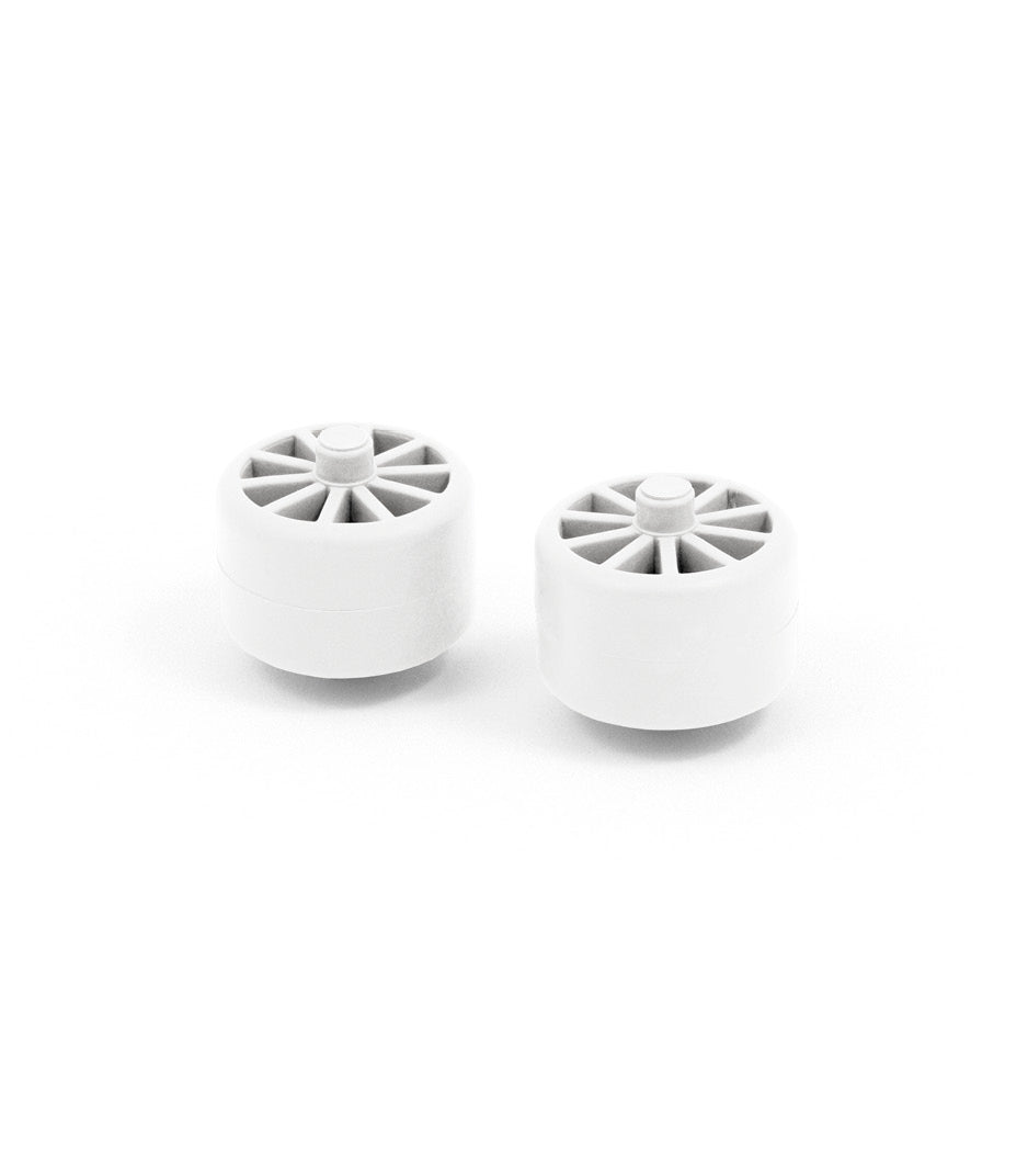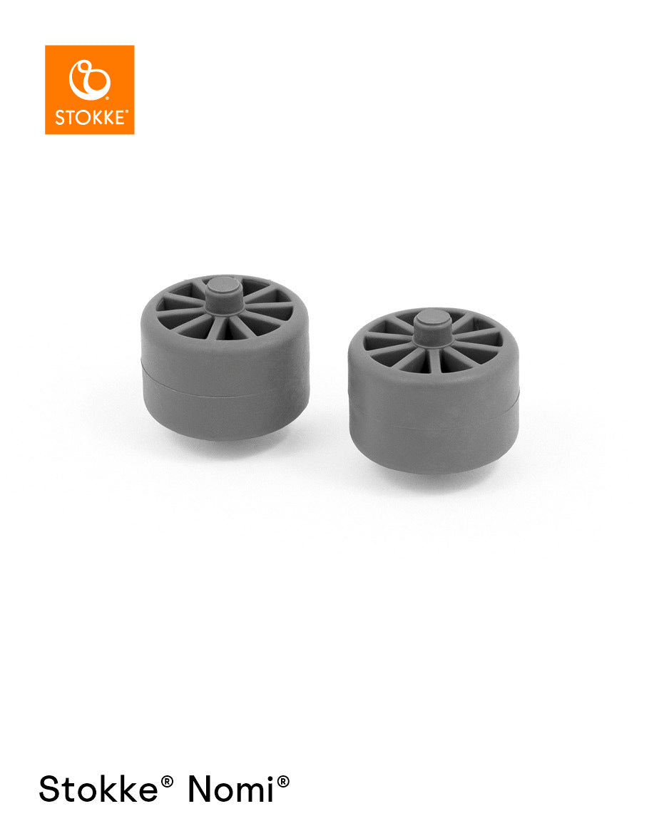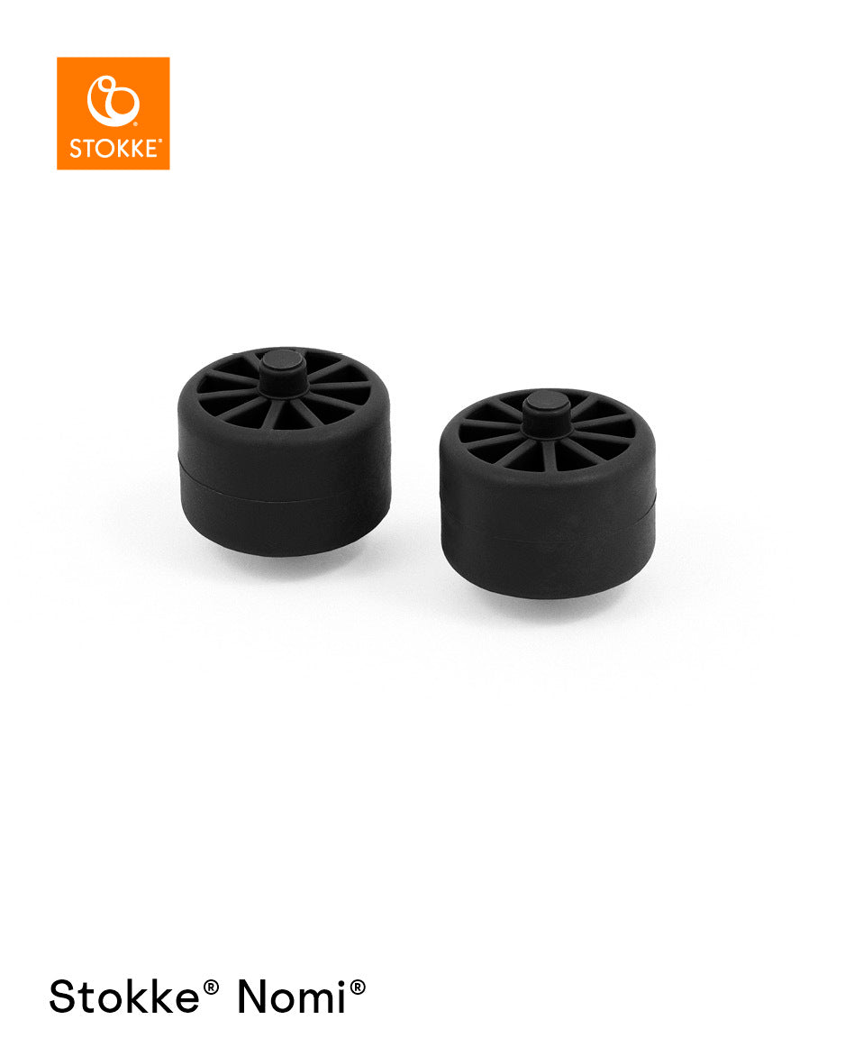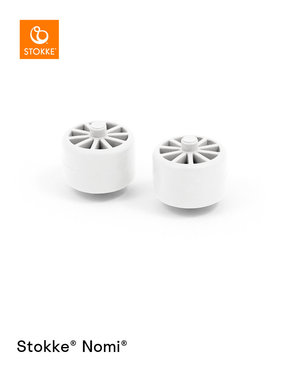 A pair of replacement anti-tilt wheels in case wheel axe is worn out. Easy click on attachment. Compatible to all Stokke Nomi Foot cross.
